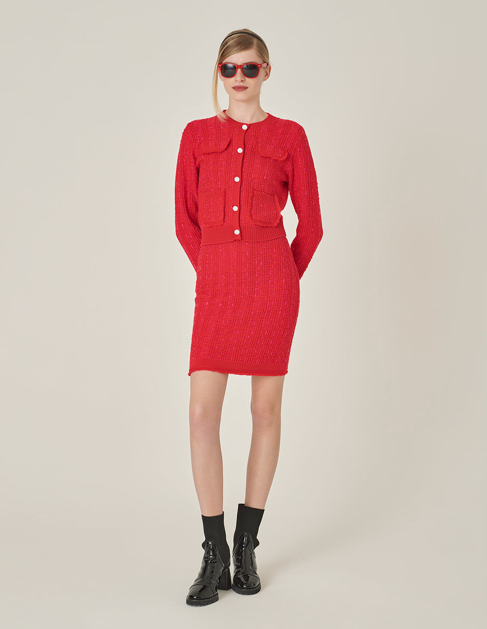 MARYLING Bright Red Mutil-Pockets Cropped Knit Cardigan