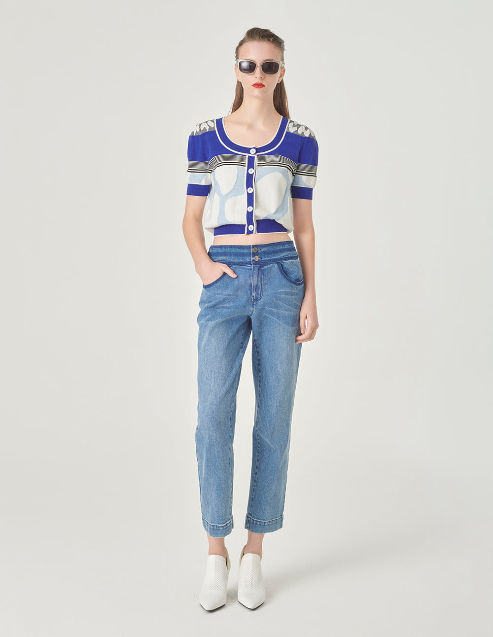 MARYLING V-Neck Multi-Pocket Long-Sleeve Jacquard Cropped Knitted Cardigan