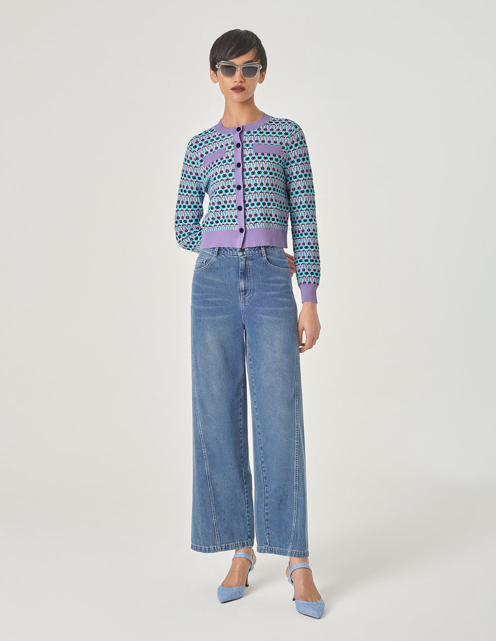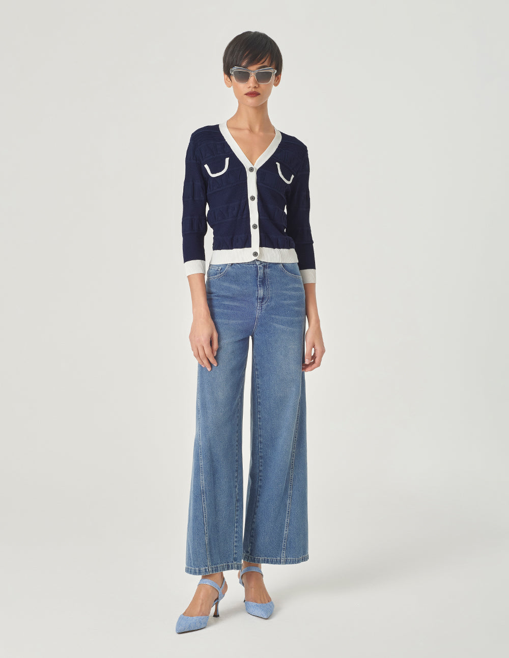 MARYLING Denim Blue V-Neck Jacquard Knitted Cardigan