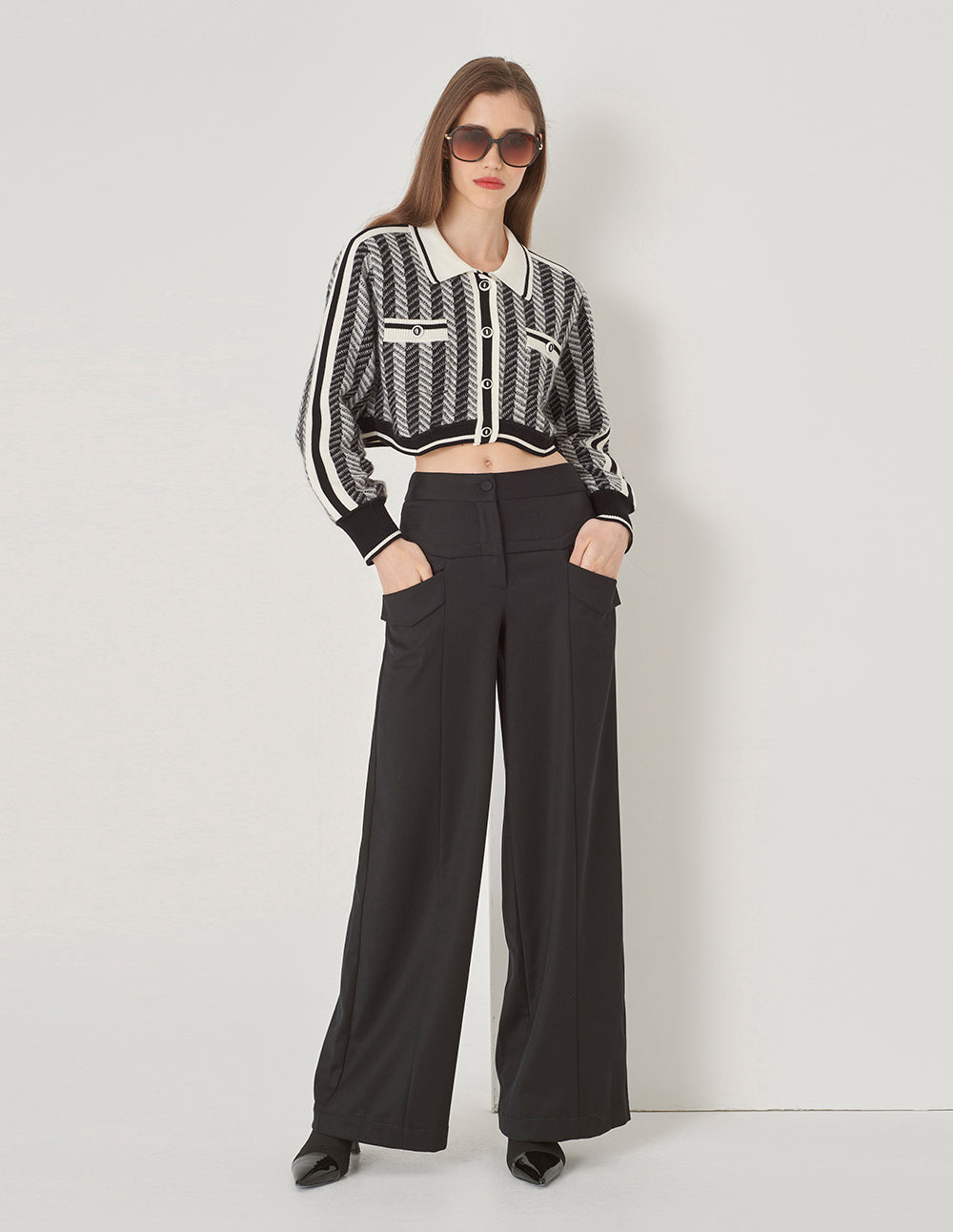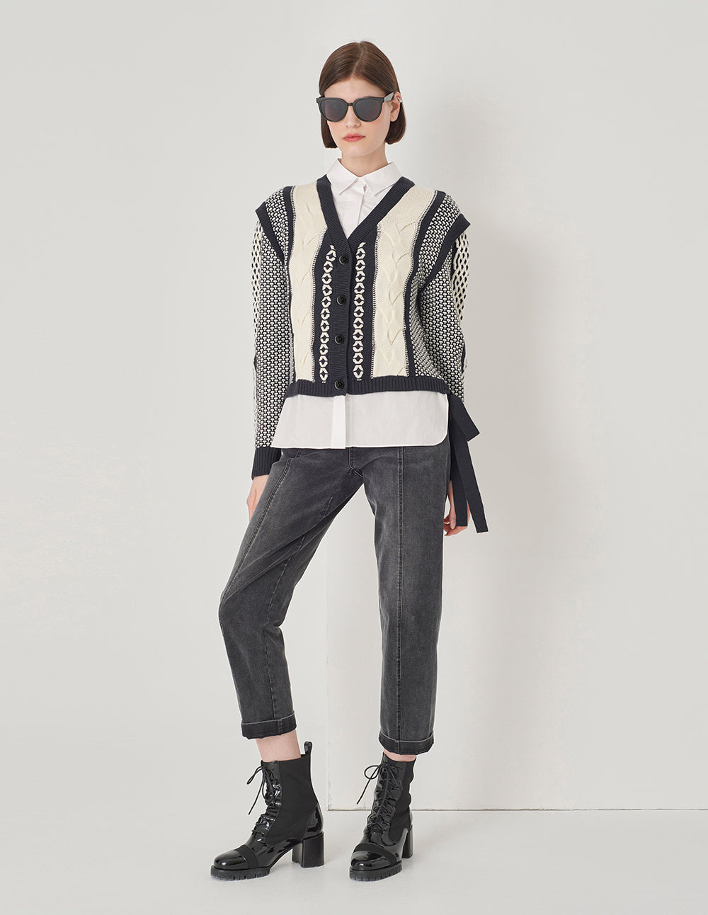 MARYLING Shirt Collar Black And White Knit Woven Cardigan