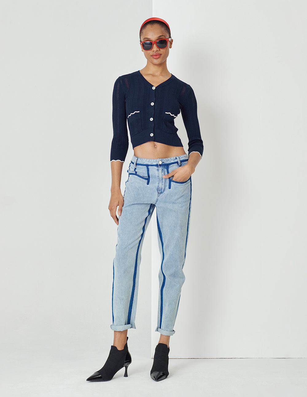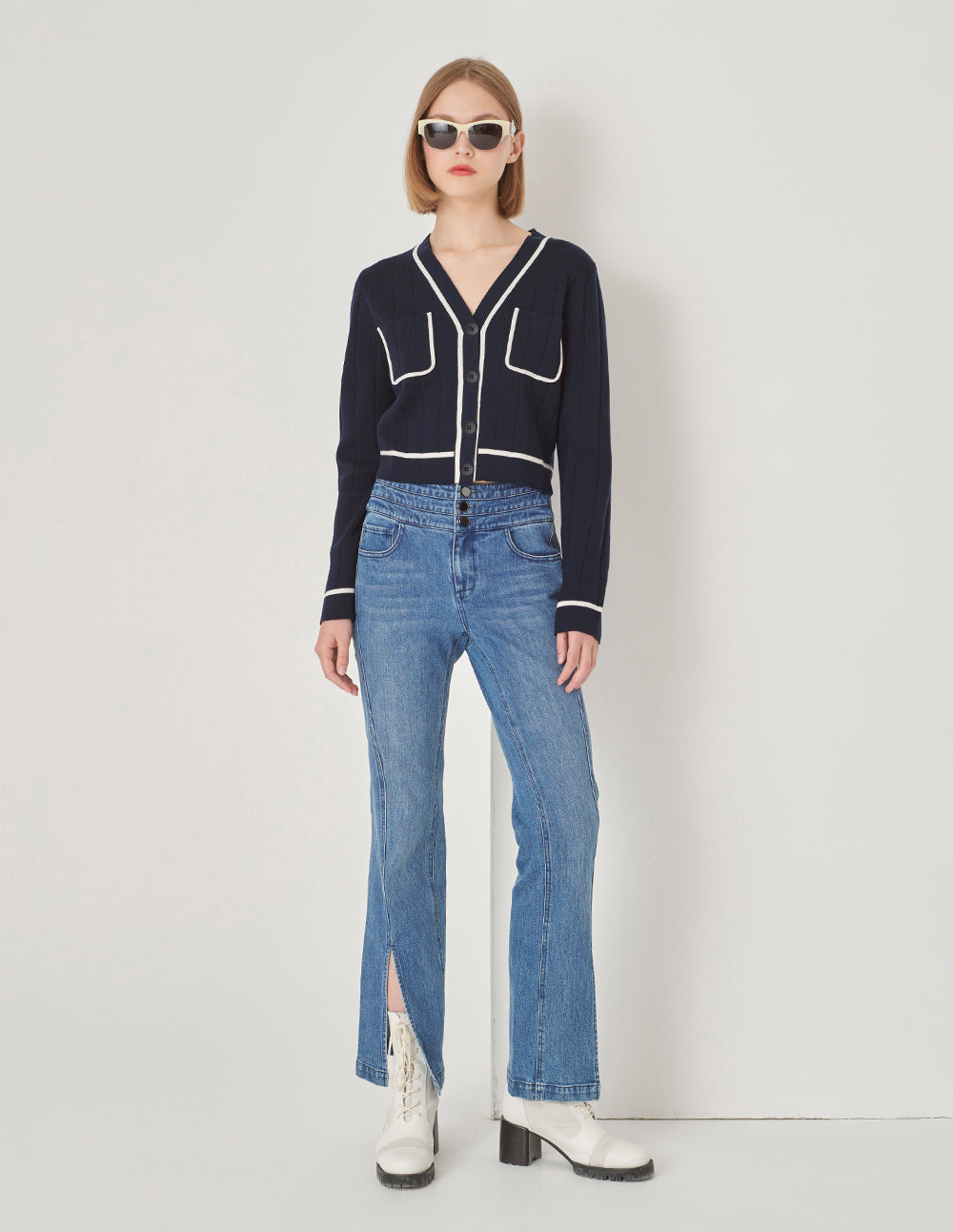 MARYLING Dark Blue Knitted Cardigan With White Trim