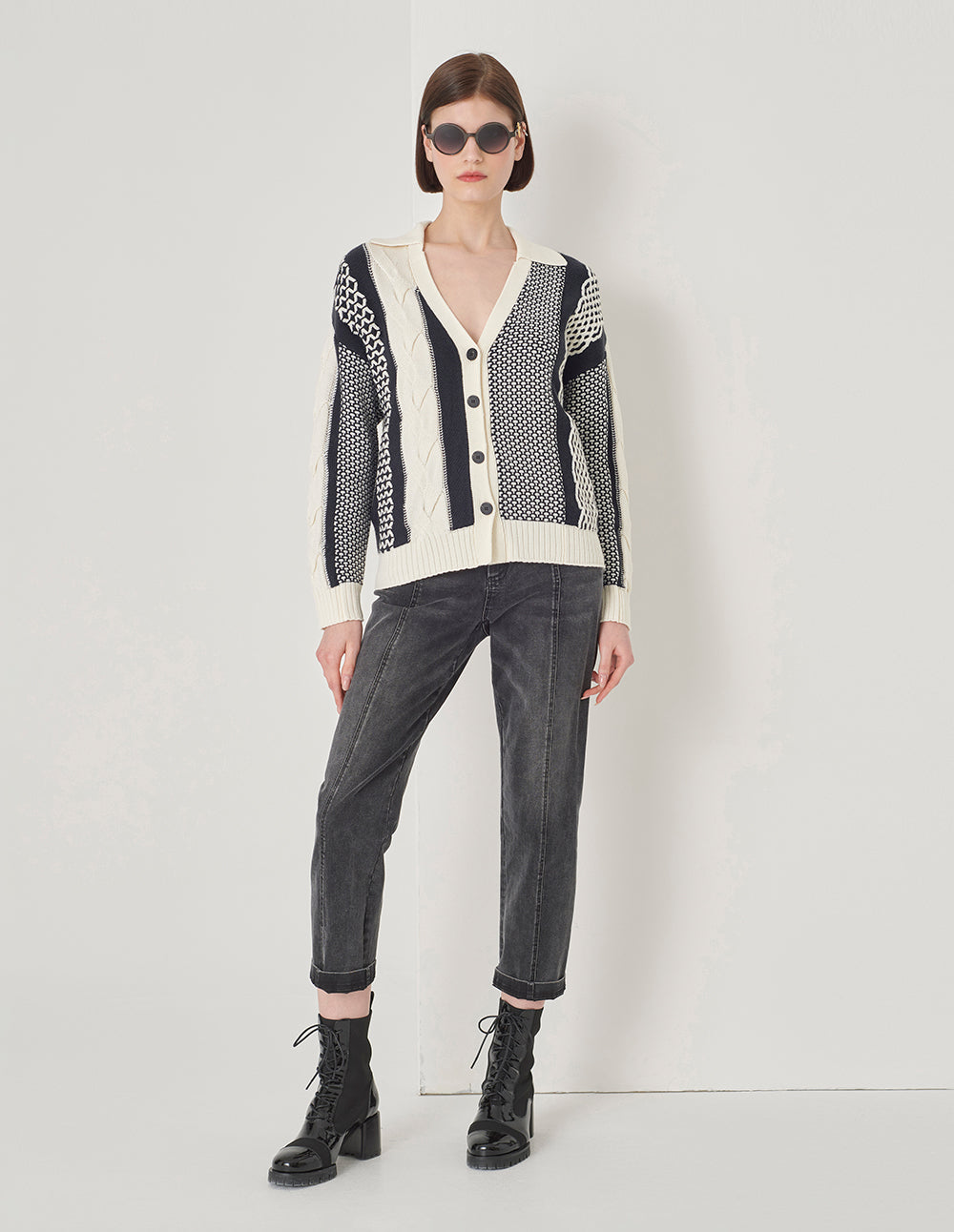 MARYLING Black And White Contrasting Design Knitted Cardigan