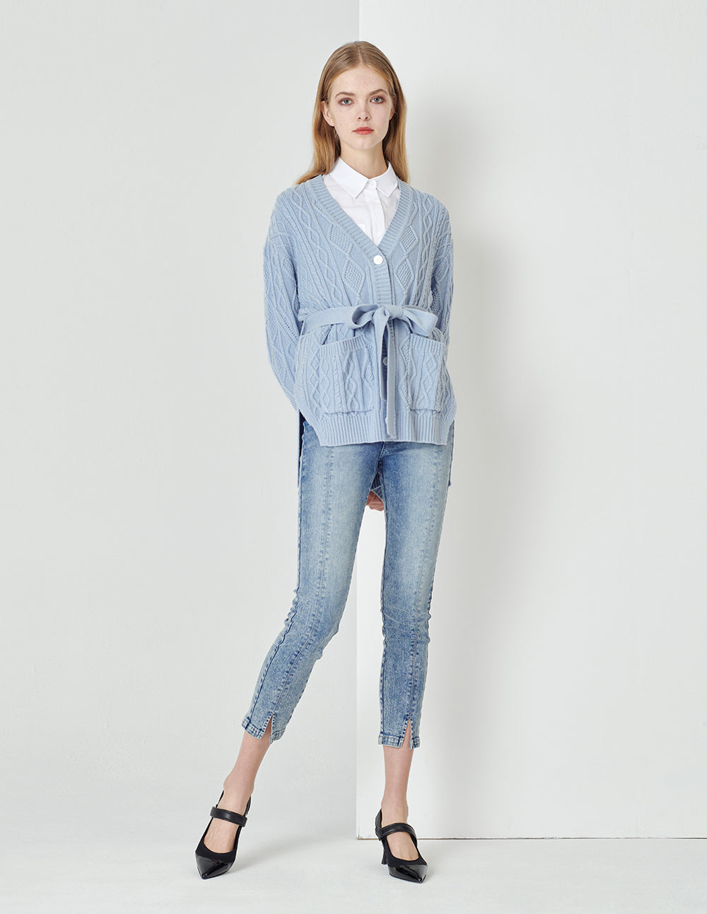 MARYLING Foggy Blue V-Neck Tied Waist Double Bag Knitted Cardigan
