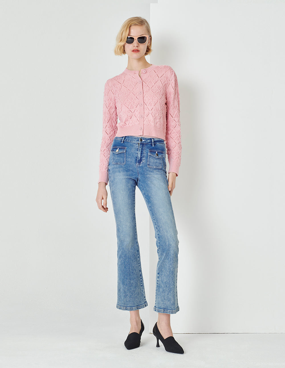 MARYLING Honey Pink Round Neck Flowers Knitted Cardigan