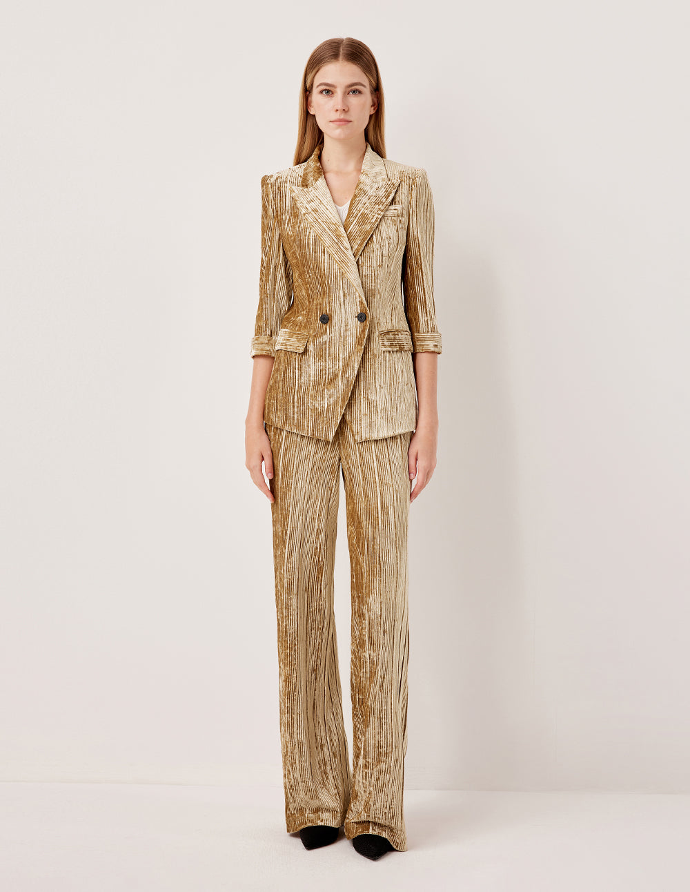 This blended fabric is crafted using a special process to recreate the soft, plush feel of velvet and the delicate, linear texture of corduroy. The colors are meticulously dyed and finished to create a vibrant play of light and shadow. The fabric's inherent elasticity ensures a crisp, defined silhouette while offering exceptional freedom of movement and comfort.