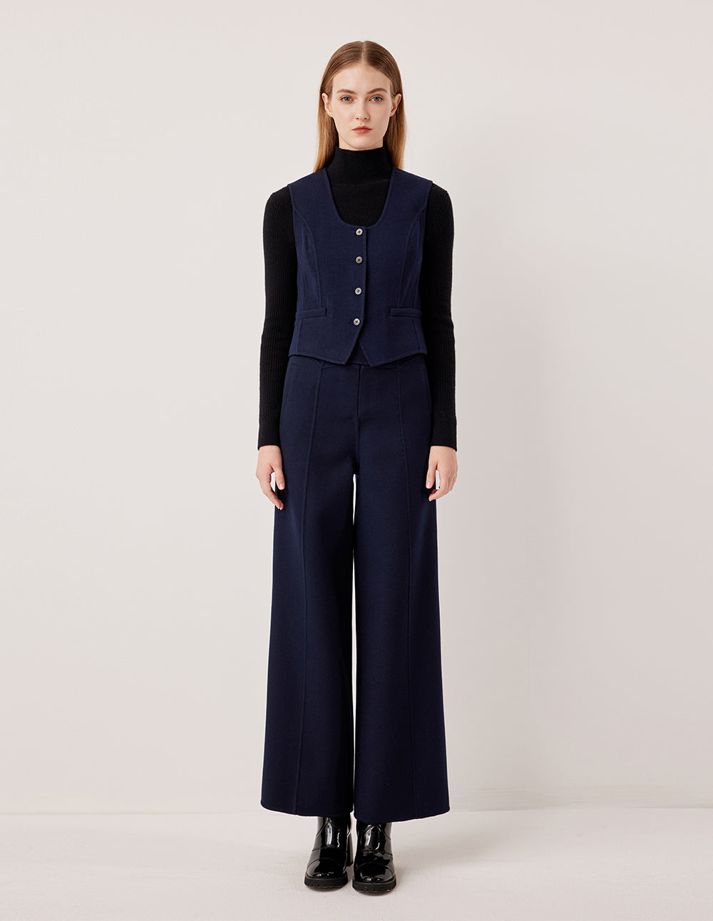 Reimagining the aesthetic of trousers with the power of simplicity, these straight-leg wide-leg trousers feature a fluid cut that flatters all leg shapes. The seamless, clean lines from waistband to hem create a look that balances professional sophistication with relaxed comfort. The button-tab detailing adds a subtle workwear touch. Whether paired with a matching vest for a suited look or a sweater for a laid-back ensemble, these trousers are a must-have in any wardrobe.