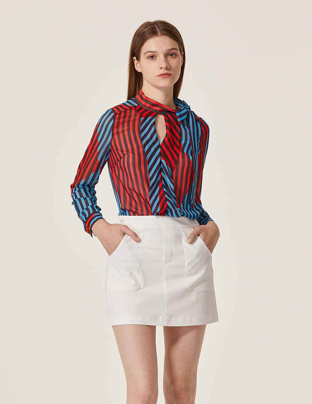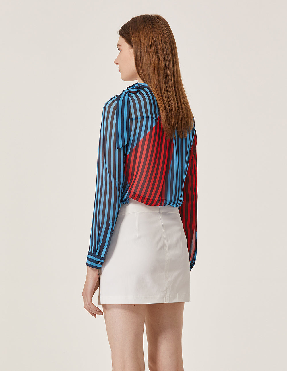 Clean solid colour, timeless fashion, flatters fair skin tones. High‑waisted cut outlines the waist and elongates the body. A‑line skirt subtly enhances the lower‑body curves.