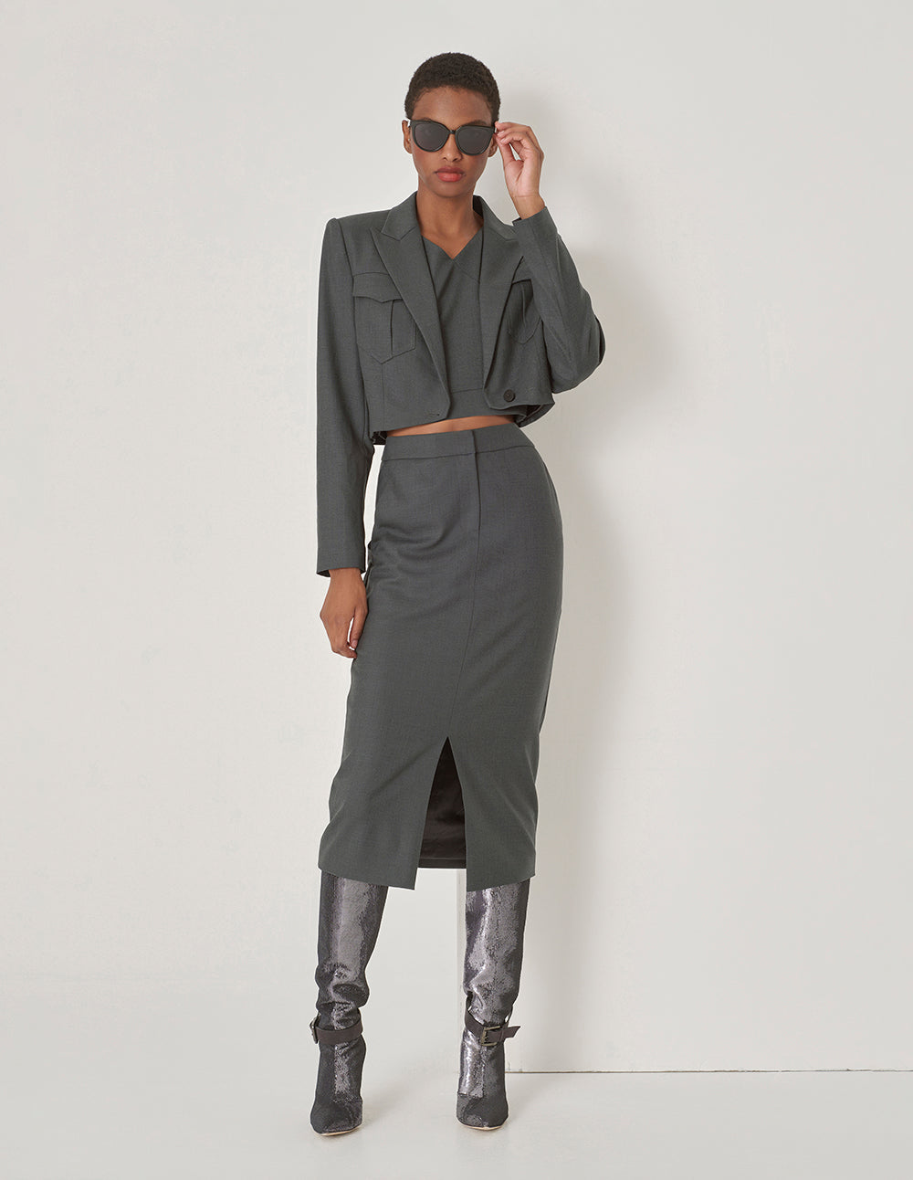 MARYLING's skirt is rendered in a premium grey, a timeless shade that remains a fashion staple. The below‑the‑knee midi length aligns with current trends, blending retro charm with modern sophistication.