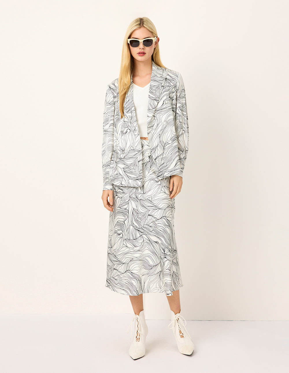 MARYLING's skirt is adorned with a clean black‑and‑white line print and finished with a romantic fishtail hem. Crafted from high‑quality silk satin, its smooth, lustrous surface can be felt with the lightest touch.