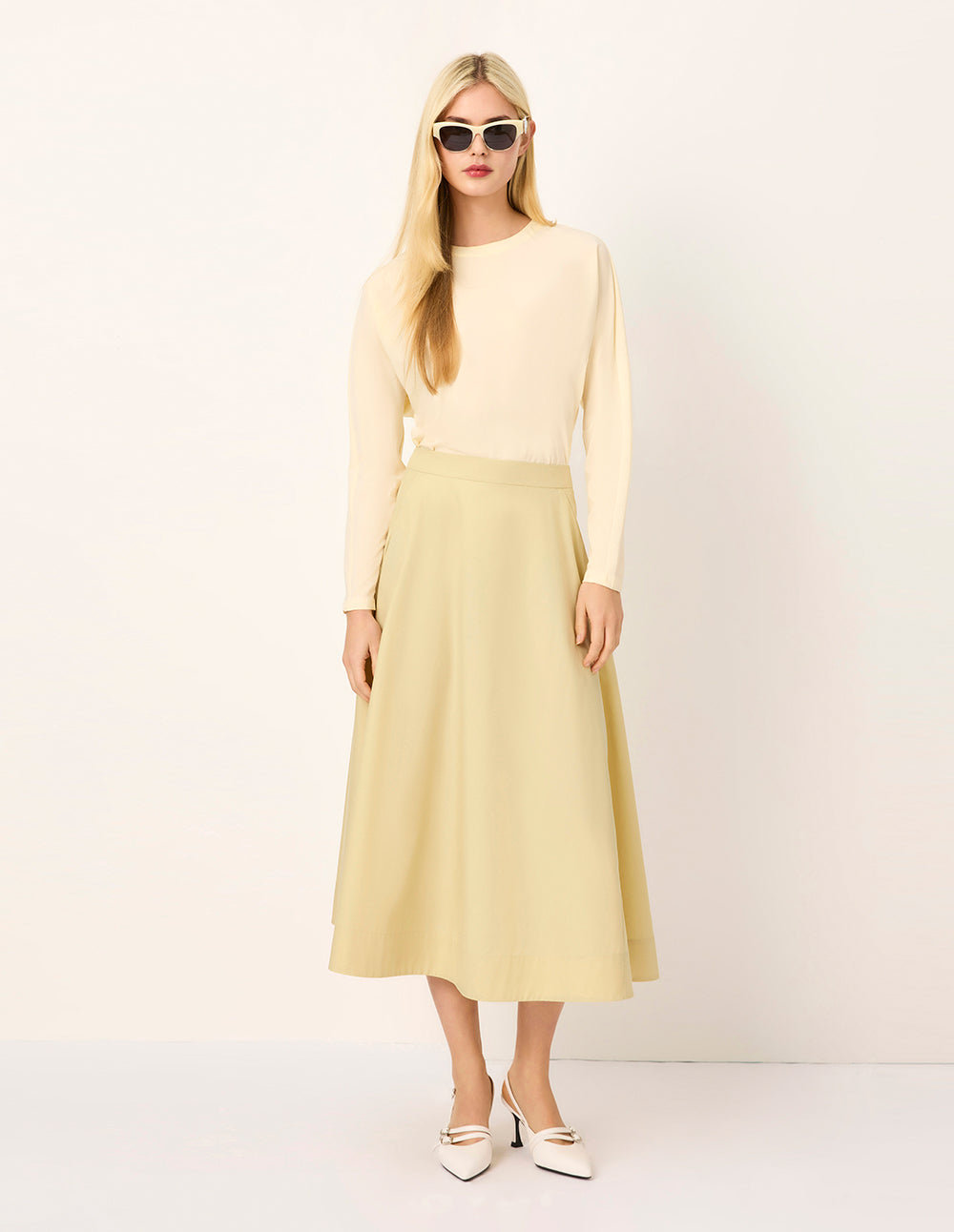 MARYLING's skirt is rendered in an elevated artichoke yellow‑green, a hue that beautifully complements fair skin tones. The waist features a diagonal seam with delicate double‑topstitching that accents its minimalist form. The graceful A‑line hem adds a romantic, feminine touch, while the naturally comfortable fabric lends a relaxed, artistic sensibility.