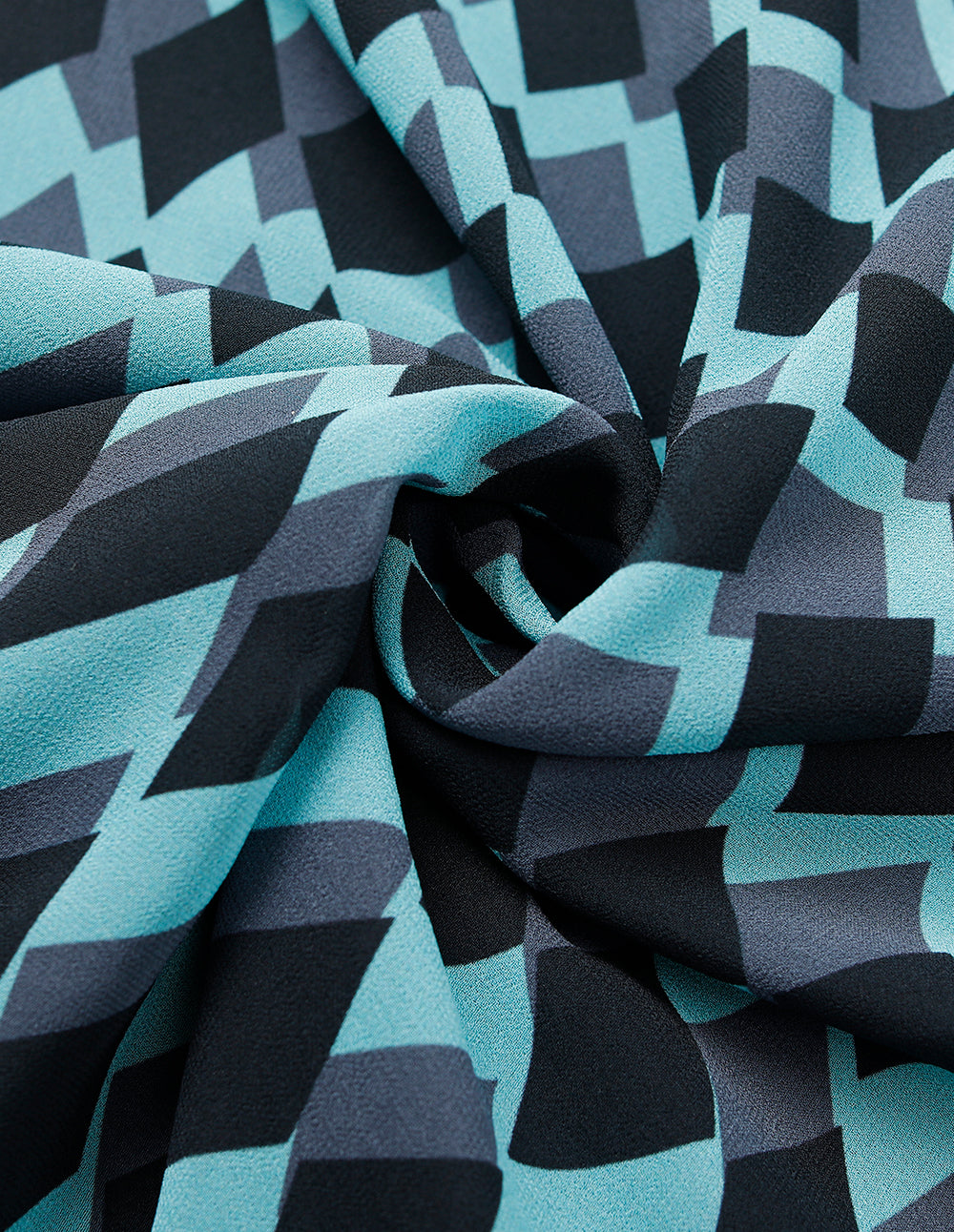 The dark‑blue diamond lines, tilted downward, visually elongate and shape the figure, tracing a graceful curve within the H‑silhouette. With movement, the fluid skirt sways like gentle ripples of water. Cut on the bias, the fabric drapes precisely to balance structure and softness.