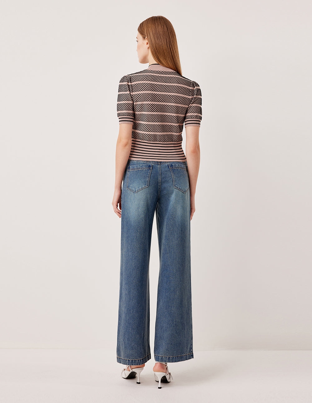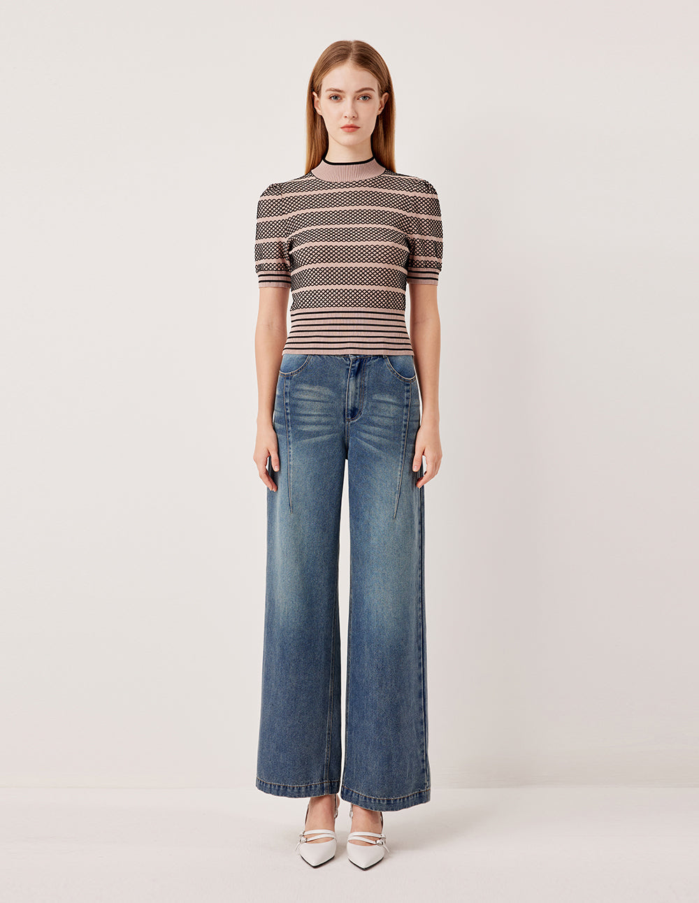 A unique lace‑texture knitting technique outlines subtle black stripes and diamond motifs on a soft gray‑pink base, weaving the secret of vintage lace into modern style. The half‑high collar, edged with black striping, flatters the neckline while adding refined detail. A short, slim cut pairs perfectly with all kinds of high‑waisted bottoms.