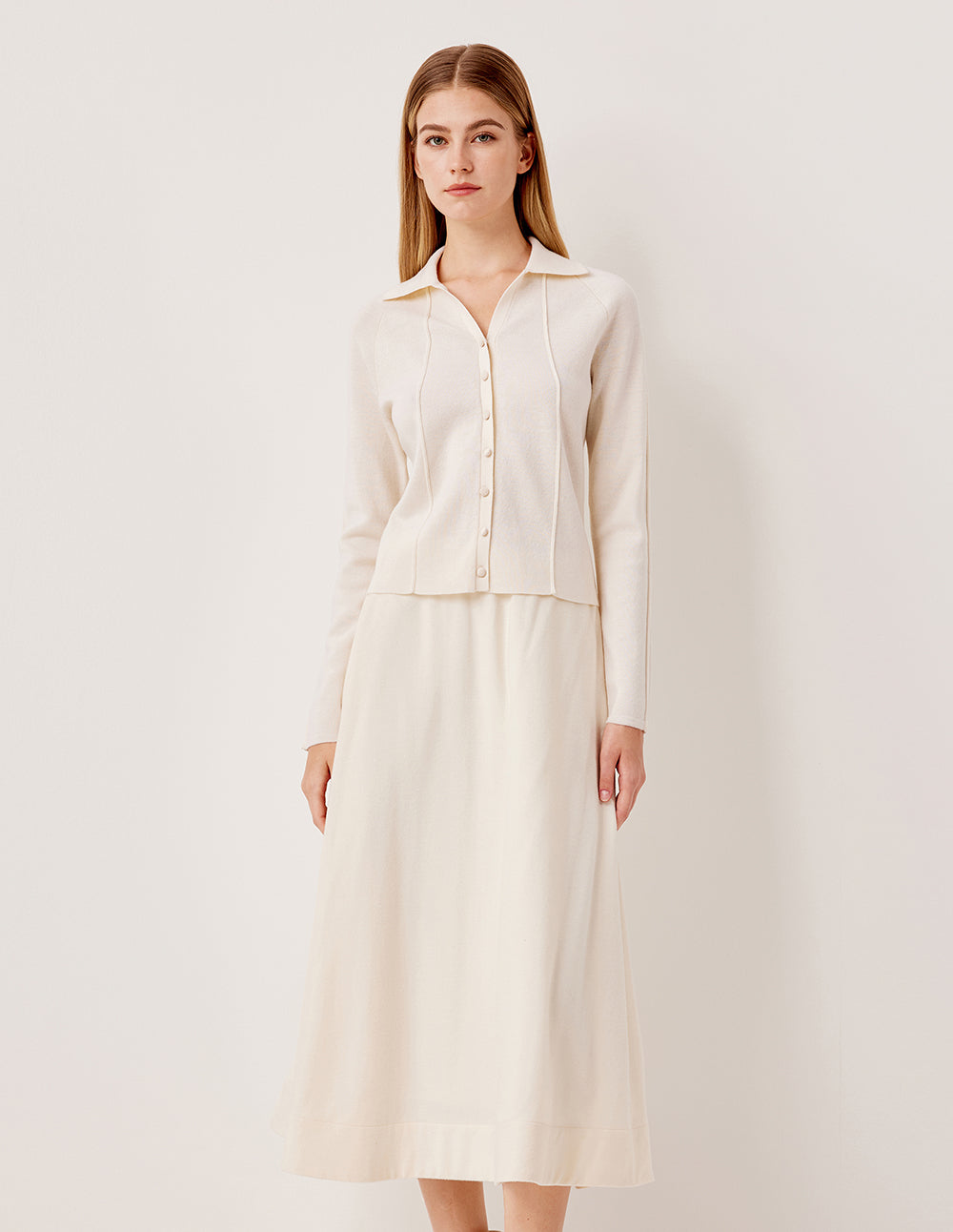 This minimalist aesthetic embodies premium quality. Its pure off‑white hue is as warm and pleasing as winter sunlight, while a shirt‑style lapel introduces a sharp counterpoint to the soft knit. Meticulously placed three‑dimensional vertical lines along the placket extend to the hem, paired with delicate button details—a garment that conceals thoughtful design within its simplicity.