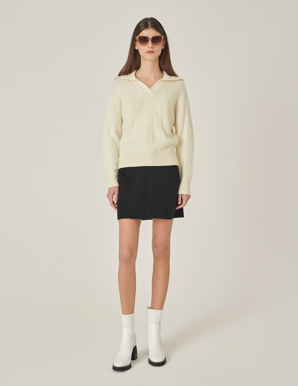 MARYLING Lapel Collar Long-Sleeve Cream-Colored Knitted Pullover