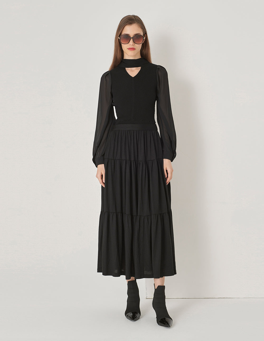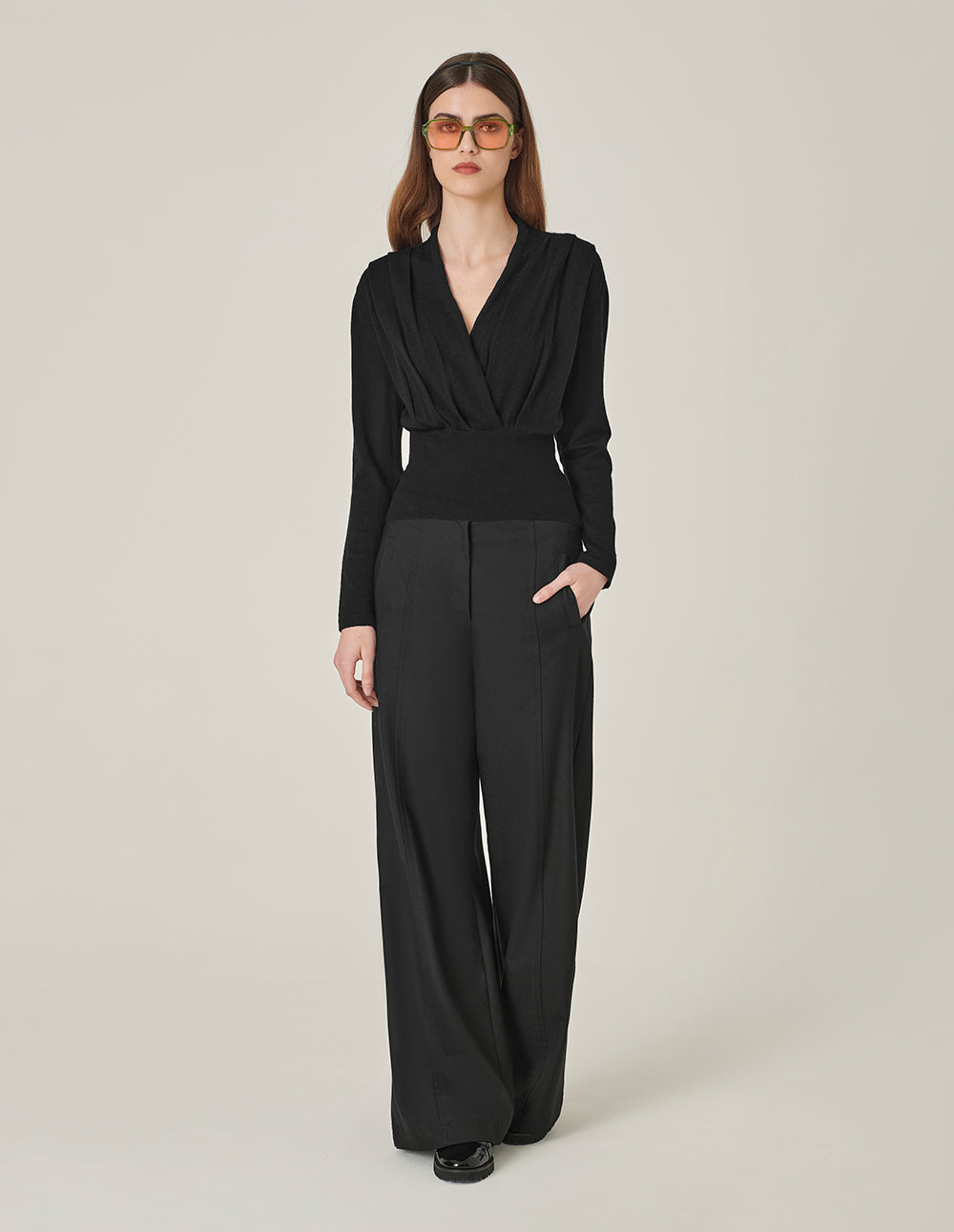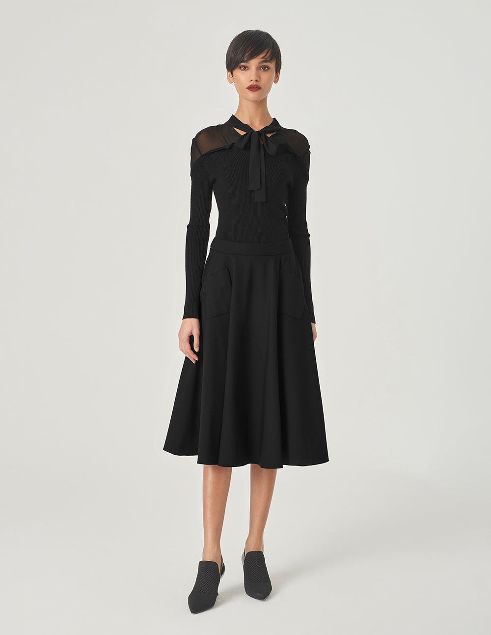 MARYLING High-Collar Tie-Front Long-Sleeve Fitted Black Thin-Pullover