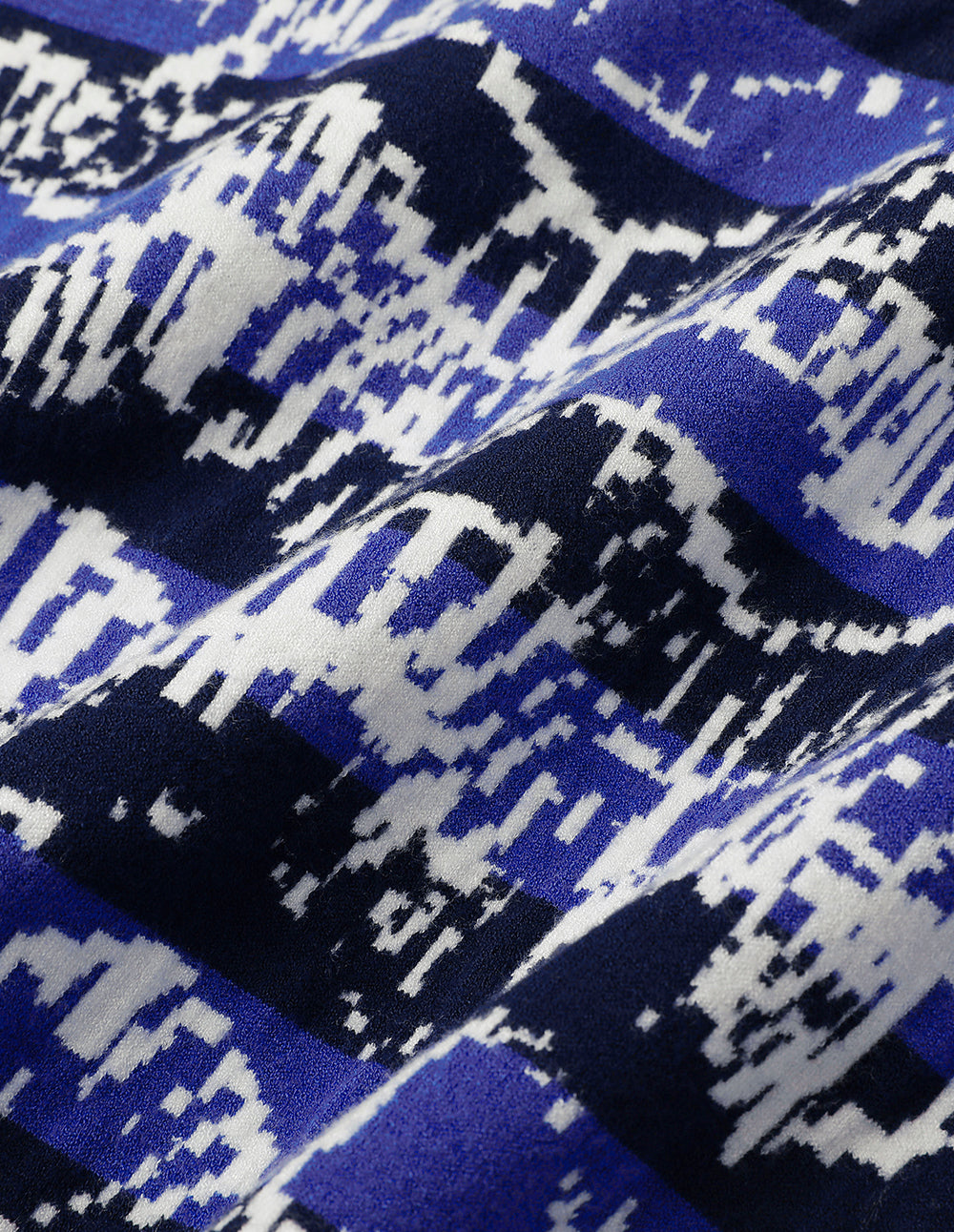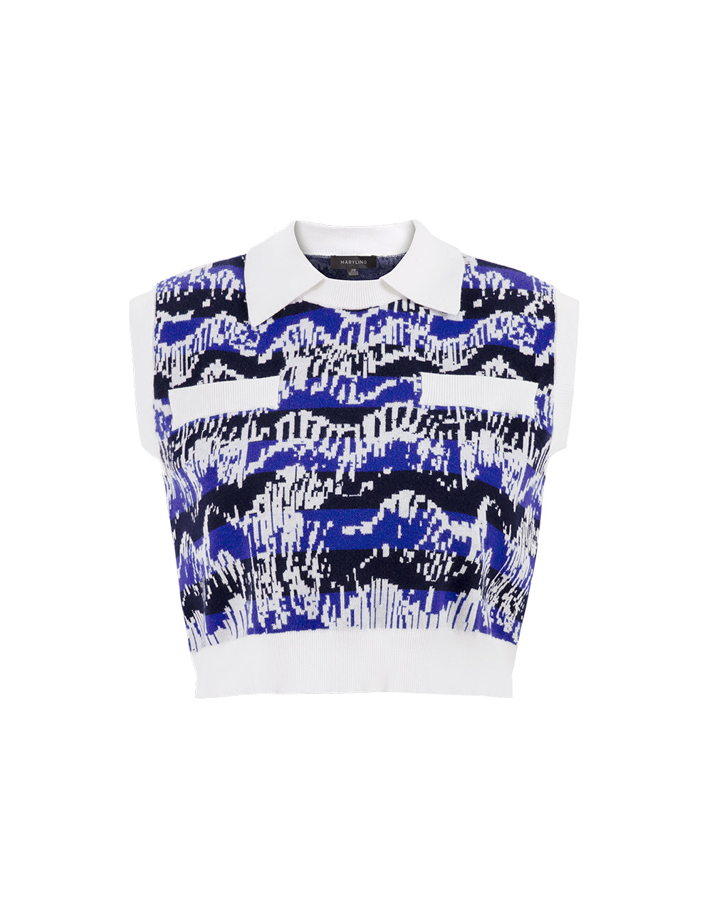 MARYLING's short vest features a camouflage‑inspired jacquard design in a classic, enduring black, white, and blue palette. The lapel style can be layered over a shirt or worn on its own, making it a standout piece whether paired with skirts or trousers.