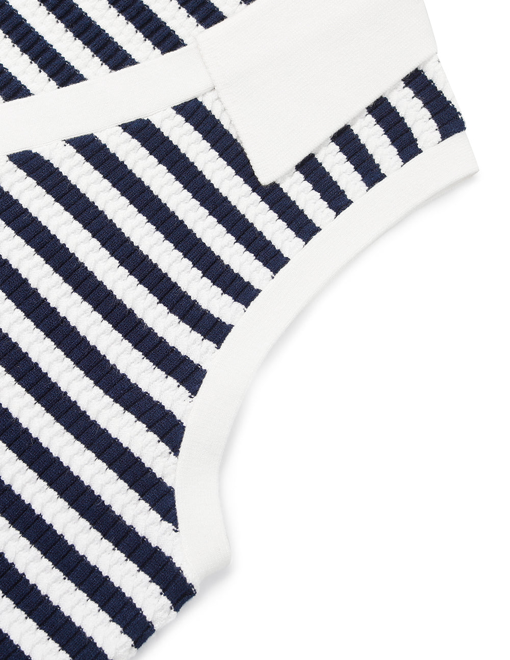 A white lapel traces the clean lines of French style, while the V‑neck extends the neckline with elegance. Black and white stripes create a visual rhythm like piano keys. Symmetrical patch pockets at the hem, along with wide ribbed borders, optimize proportions for a slimmer silhouette.