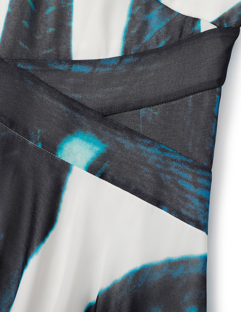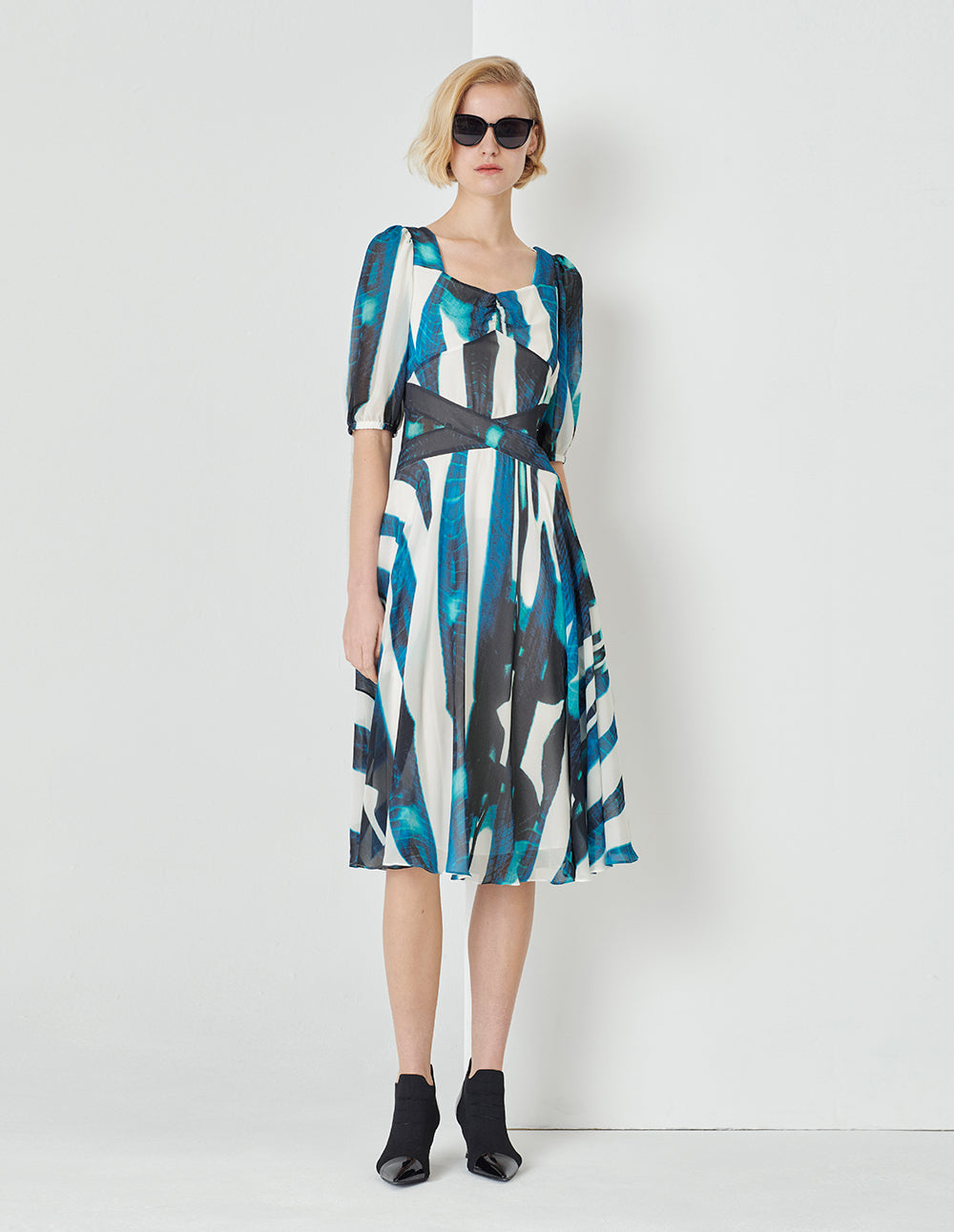 MARYLING's elegant V‑neck dress features a vibrant Georgette print with a bold color palette. Criss‑cross waist detailing and a flared hem create a flattering silhouette, adding effortless feminine elegance to everyday style.